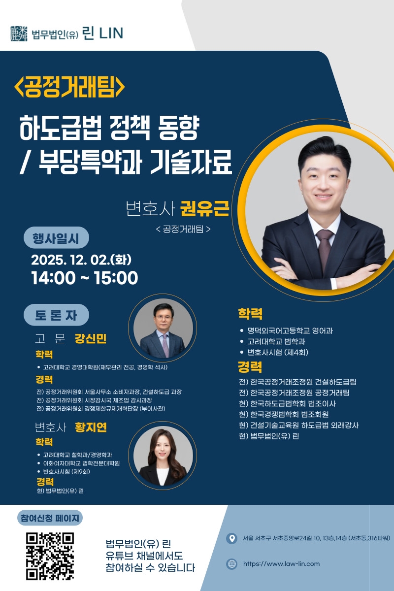 린소식법무법인(유) 린 권유근 변호사, 한국하도급법학회 발표지난 2025년 11월 14일 금요일, 하도급 분야의 법적 쟁점을 논의하는 '한국하도급법학회 연구반' 세미나가 개최되었습니다. 이날 법무법인(유)린 공정거래팀의 권유근 변호사는 '하도급법상 사인의 금지청구권'에 대한 주제를 발표하였습니다. 이번 세미나는 한국공정거래조정원 소속 박사급 전문가들을 비롯하여, 김·장 법률사무소 및 법무법인(유한) 태평양 소속 변호사 등 국내 하도급 분야를 이끄는 전문가들이 대거 참석하여 그 의미를 더했습니다. 권유근 변호사는 발표를 통해, 최근 업계의 큰 관심사인 사인의 금지청구권 제도의 입법 과정과 핵심 내용을 심도 있게 분석했습니다. 또한, 이와 관련된 법원의 판례 태도를 면밀하게 검토하고, 관련 정부 부처와 공정거래위원회의 최신 동향까지 상세히 공유하며 참석자들에게 현장감 있는 정보를 제공했습니다. 발표에 이어진 토론 세션에서는 김민성 대법원 재판연구관이 토론자로 참여하여, 법리적·실무적 차원에서 깊이 있는 질의와 의견을 더하며 해당 주제에 대한 논의를 한층 더 풍부하게 만들었습니다. 권유근 변호사는 향후에도 이번 학회에서 논의된 내용을 바탕으로, 관련 입법 동향과 후속 판례의 흐름을 면밀히 주시할 계획입니다. 또한, 이를 토대로 기업 현장에서 발생할 수 있는 실무적 분쟁에 대한 효과적인 법률 자문을 제공하고, 공정한 하도급 거래 질서 확립에 기여하기 위한 연구 활동을 지속해 나갈 것이라고 밝혔습니다.2025.11.18.