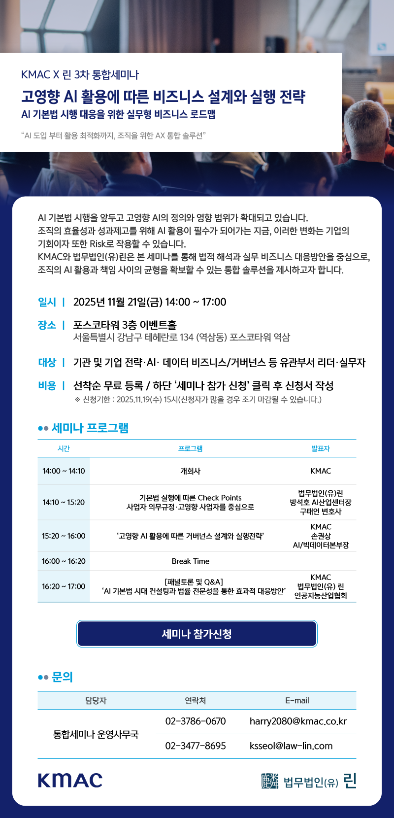 이에 한국능률협회컨설팅(대표이사 사장 한수희, 이하 KMAC)은 법무법인(유한) 린(대표 변호사 임진석, 이하 법무법인(유) 린)과 공동으로 ‘AI 기본법 시행 대응 전략’ 주제 제3차 통합 세미나를 오는 21일 서울 강남구 포스코타워 3층 이벤트홀에서 개최한다.