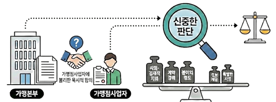 따라서 법원이 가맹계약 과정에서 가맹계약에 관하여 가맹본부와 가맹점사업자 사이에 가맹점사업자에게 불리한 내용의 묵시적 합의가 성립된 사실을 인정하려면 가맹본부와 가맹점사업자의 사회․경제적 지위, 가맹계약 체결 경위와 전체적인 내용, 가맹점사업자에게 그와 같은 묵시적 합의 체결의 의사를 표시할 수 있을 정도로 충분한 정보가 제공되었는지 여부, 가맹본부가 법적 불확실성이나 과징금 부과 등의 불이익을 무릅쓰면서까지 합의 내용을 가맹계약서에 명시하지 않을 특별한 사정이 있는지 여부, 그와 같은 계약 내용으로 인하여 가맹점사업자가 입는 불이익의 정도, 거래 관행 등을 종합적으로 고려하여 신중하게 판단하여야 합니다.