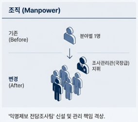 공정위는 익명 제보 처리의 실효성을 제고하기 위하여 조직과 인력을 대대적으로 확충하기로 하였습니다. 기존에는 하도급, 유통 등 각 분야별로 단 1명의 담당자가 제보 분석 업무를 수행해 왔으나, 향후 조직 개편을 통해 각 분야별로 최대 5인 규모의 ‘익명제보 전담조사팀’을 별도로 구성할 예정입니다. 전담 인력이 5배로 늘어나는 만큼, 과거 인력 부족으로 처리하지 못했던 많은 제보들이 실제 직권조사로 이어질 가능성이 매우 높아졌습니다.