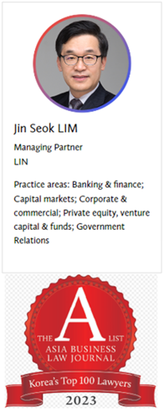 Managing Partner Jin Seok LIM has been recognized globally for his expertise and competence by being selected as one of "Korea's Top 100 Lawyers 2023" by Asia Business Law Journal.