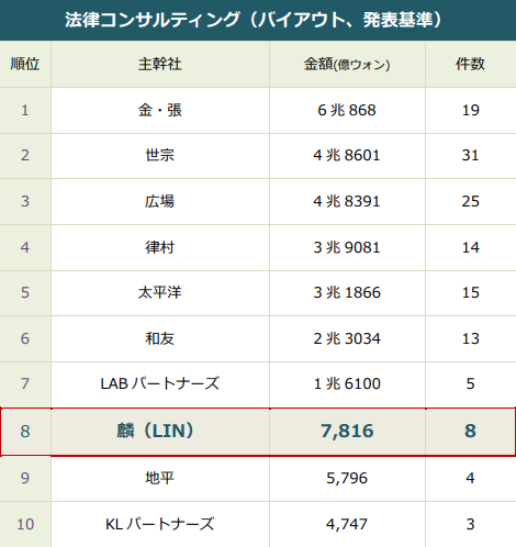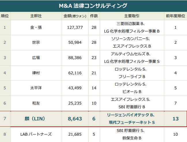 上半期のリーグテーブルでは、主要な大手ローファームが激しい順位競争を繰り広げましたが、法務法人(有) 麟(LIN)は短期的な成果にこだわるのではなく、長期的な観点から顧客との深い信頼関係を構築し、持続的な能力強化を通じて堅実な成長傾向を維持しています。