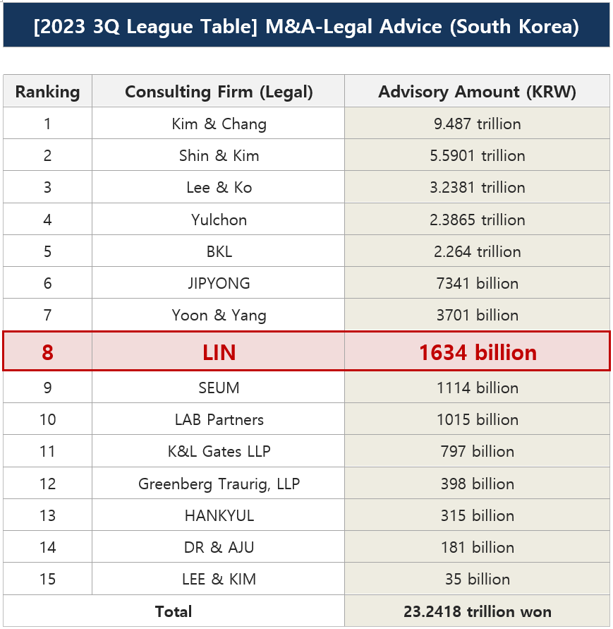 Lin ranked 8th among law firms in the third quarter 2023 league table compiled by DealSite with a total deal value of KRW 163.4 billion. The firm was also ranked in the "Top 10" in the first half of 2023 M&A legal advisory performance compiled by Invest Chosun. Lin, which is solidifying its position as one of the top ten law firms based in Korea, continued to strengthen its position in the domestic M&A market this quarter by successfully leading large-scale deals, such as KNW and TIRTIR, based on its strong expertise and teamwork.