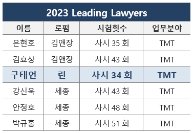로펌에서 활동하는 변호사들의 업무 전문화가 갈수록 세분화되고 전문성이 한층 심화되고 있는 가운데, 법률전문지 리걸타임즈는 이러한 동향을 반영하여 한국의 기업법무 전문 변호사들을 TMT, IP, 증권 · 금융, Corporate and M&A 등 13개 분야에 걸쳐 '2023 한국의 리딩로이어(Leading Lawyers 2023)'로 선정하고 있습니다.