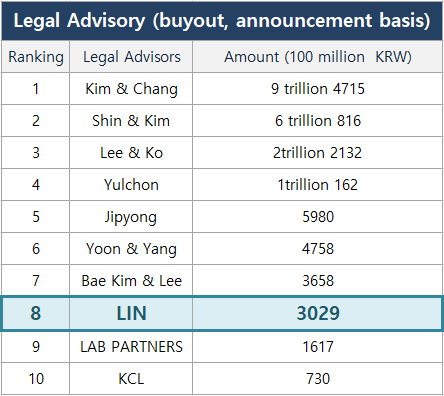LIN came in 8th place in legal counselling in the Market Insights 2024 Q2 M&A League Table compiled by The Korea Economic Daily and FnGuide, with a deal value of KRW 302.9 billion. Last year, LIN ranked 8th among legal advisors in DealSite's 2023 Q3 League Table, and this year, the firm continued to successfully lead large-scale transactions with its high level of expertise and experience, cementing its position as a "Top 10" law firm in the M&A market.
