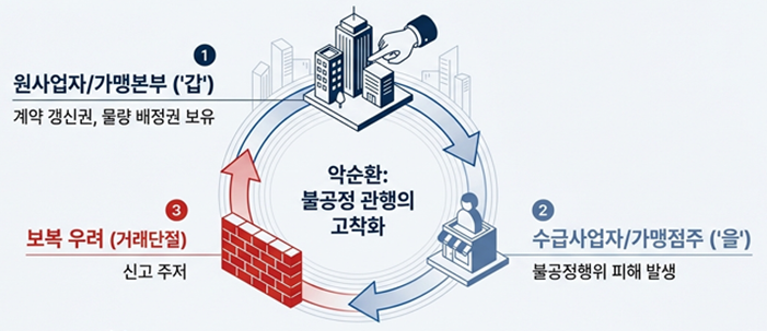 하도급 및 가맹·유통 분야의 거래는 원사업자나 가맹본부와 같은 ‘갑’의 지위에 있는 사업자가 계약의 갱신권이나 물량 배정권을 쥐고 있는 경우가 많습니다. 이러한 구조적 비대칭성으로 인해 수급사업자나 가맹점주는 명백한 불공정 행위를 당하더라도 이를 외부에 알리는 순간 ‘거래 단절’ 등의 보복을 당할 것을 우려하게 되고, 이는 외부로 드러나지 않는 ‘숨어있는 불공정 관행’이 지속되는 가장 큰 원인이 되었습니다.